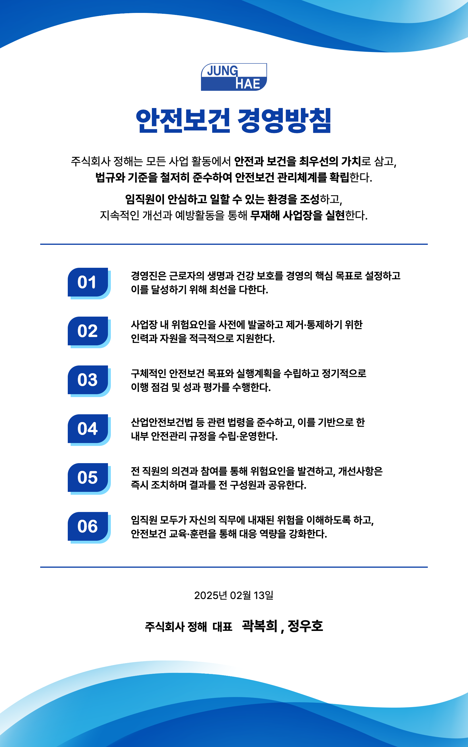 안전보건은 정해의 모든 시공의 시작이자 기본입니다.